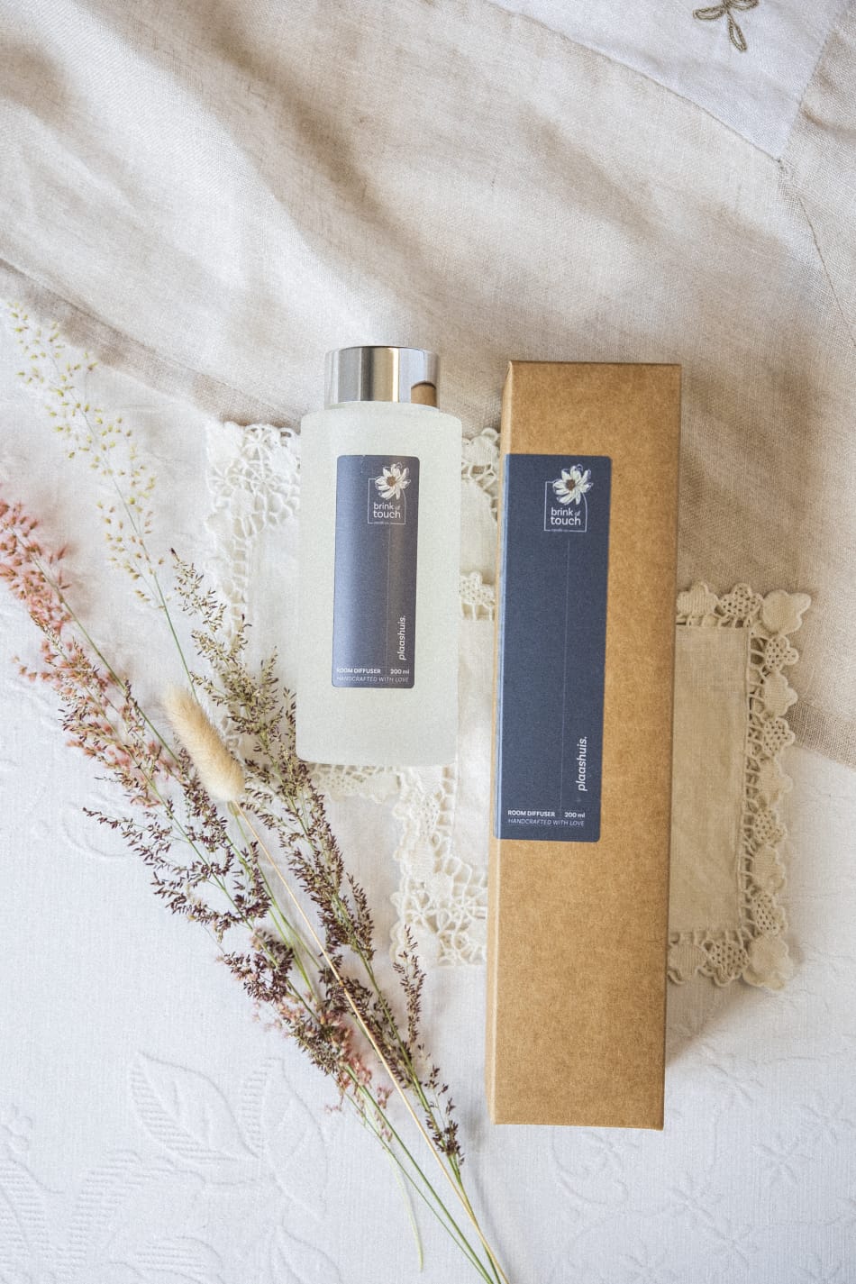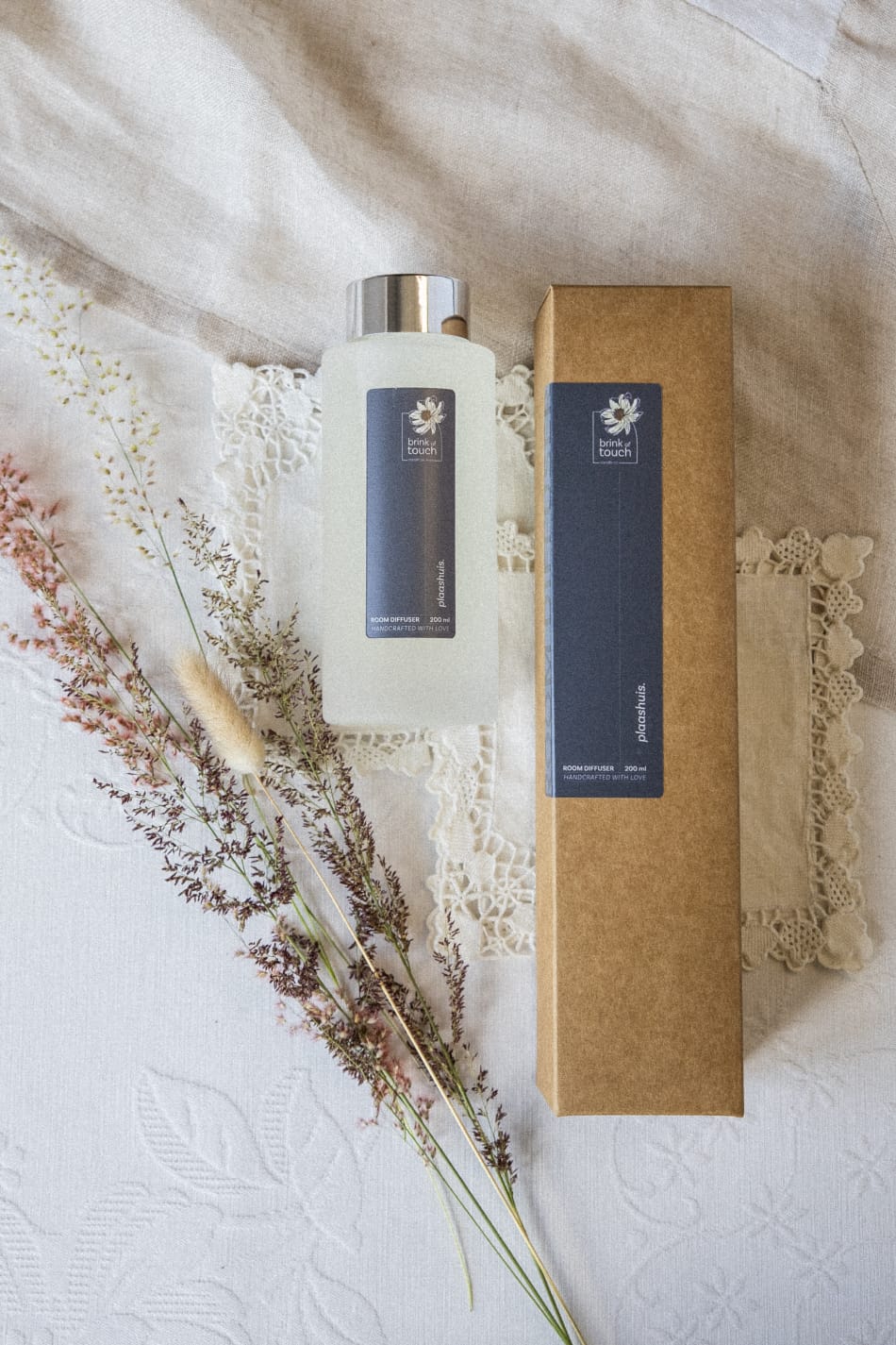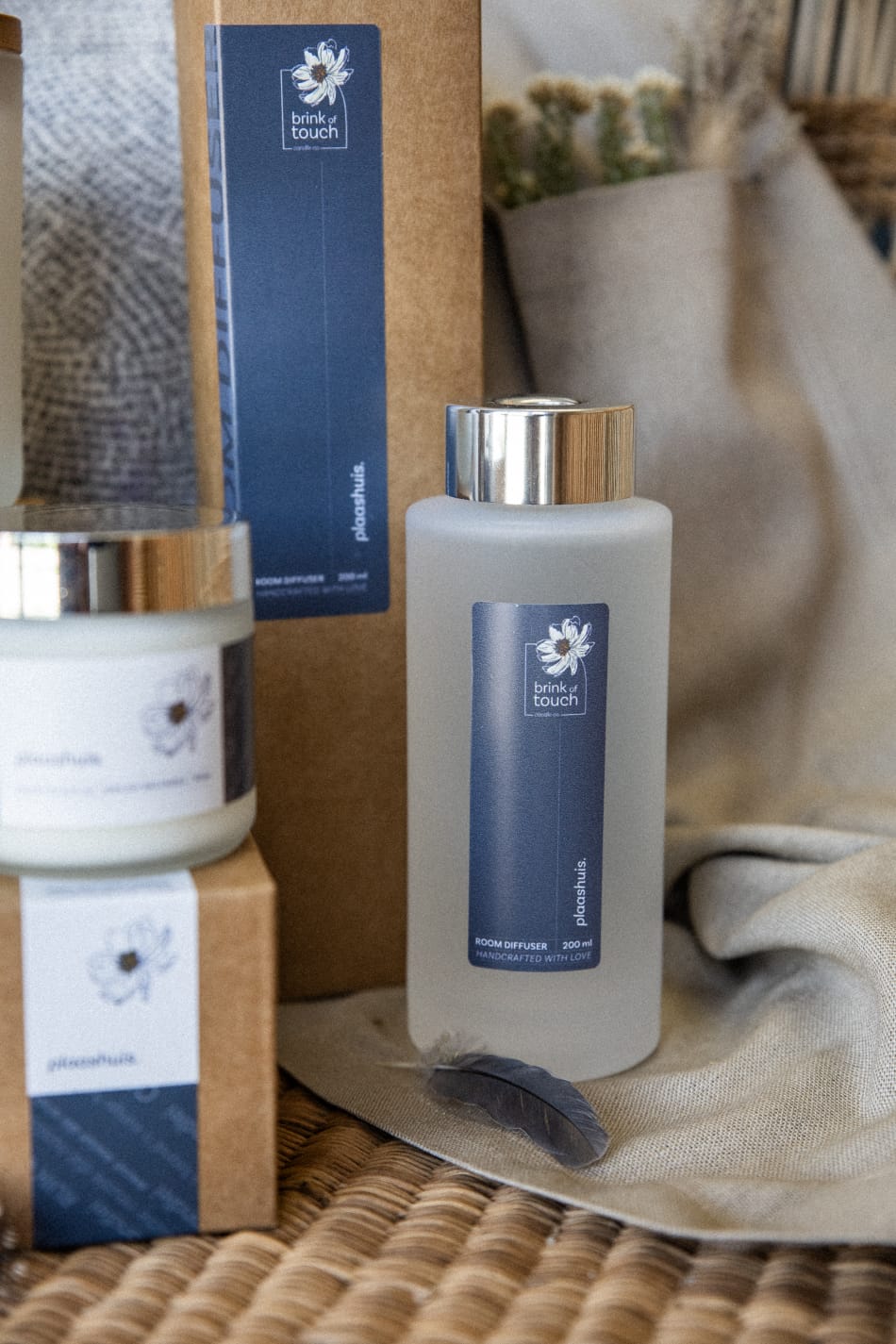 • 200ml gegeurde olie in wit "frosted" glas houer met 'n silver doppie. elke boksie met 'n diffuser bevat 6 vesel stokkies