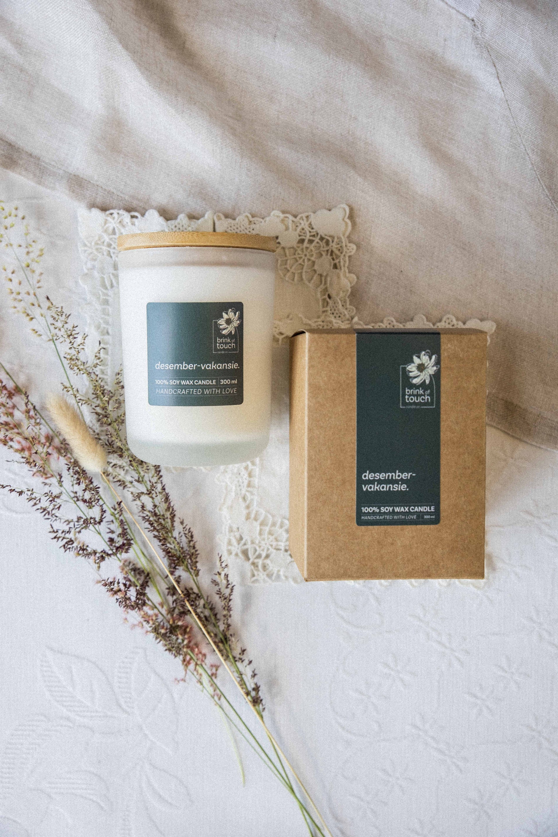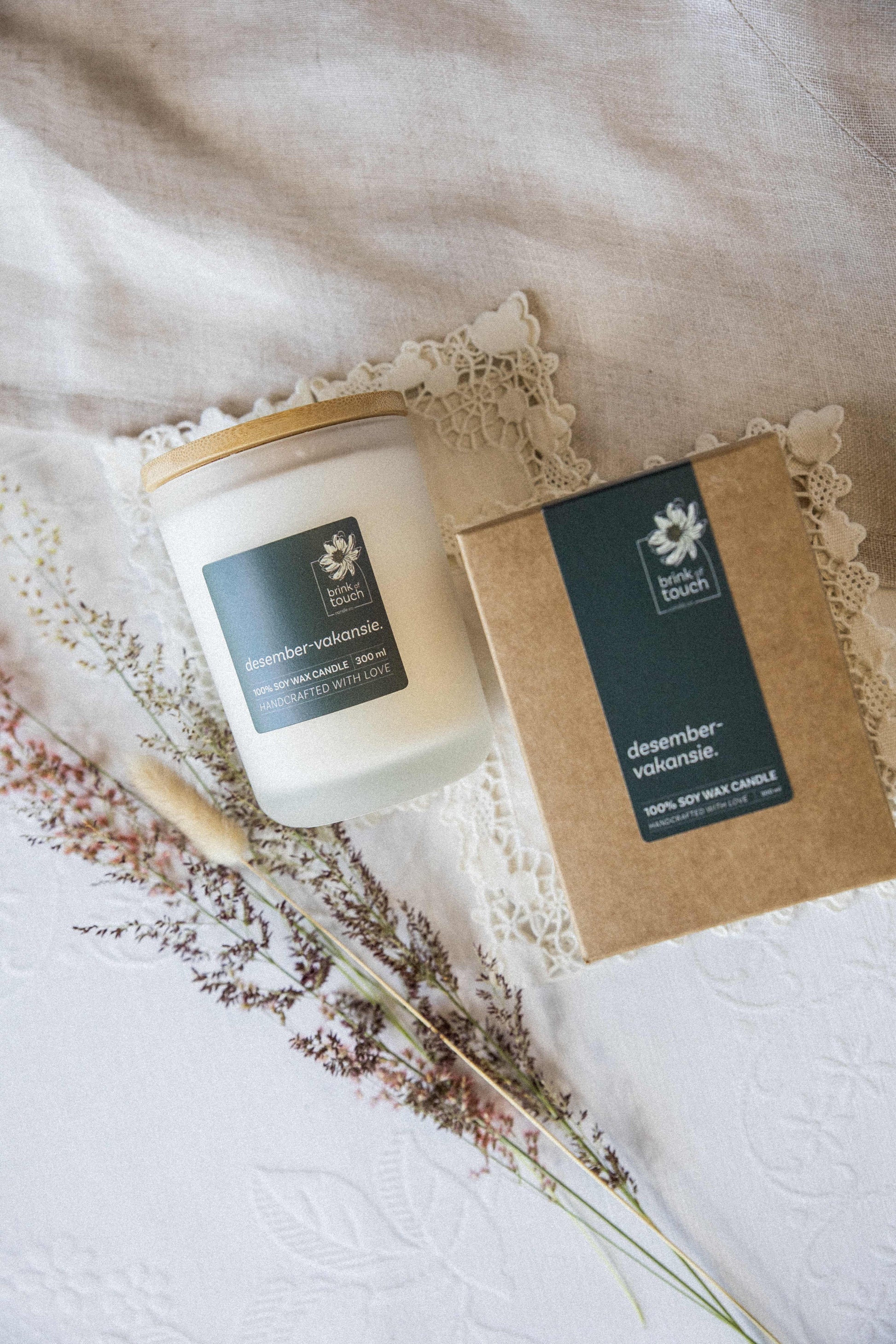 • 300ml sojawas in wit "frosted" glas houer met 'n bamboes deksel wat seel om jou kerswas skoon en vars te hou